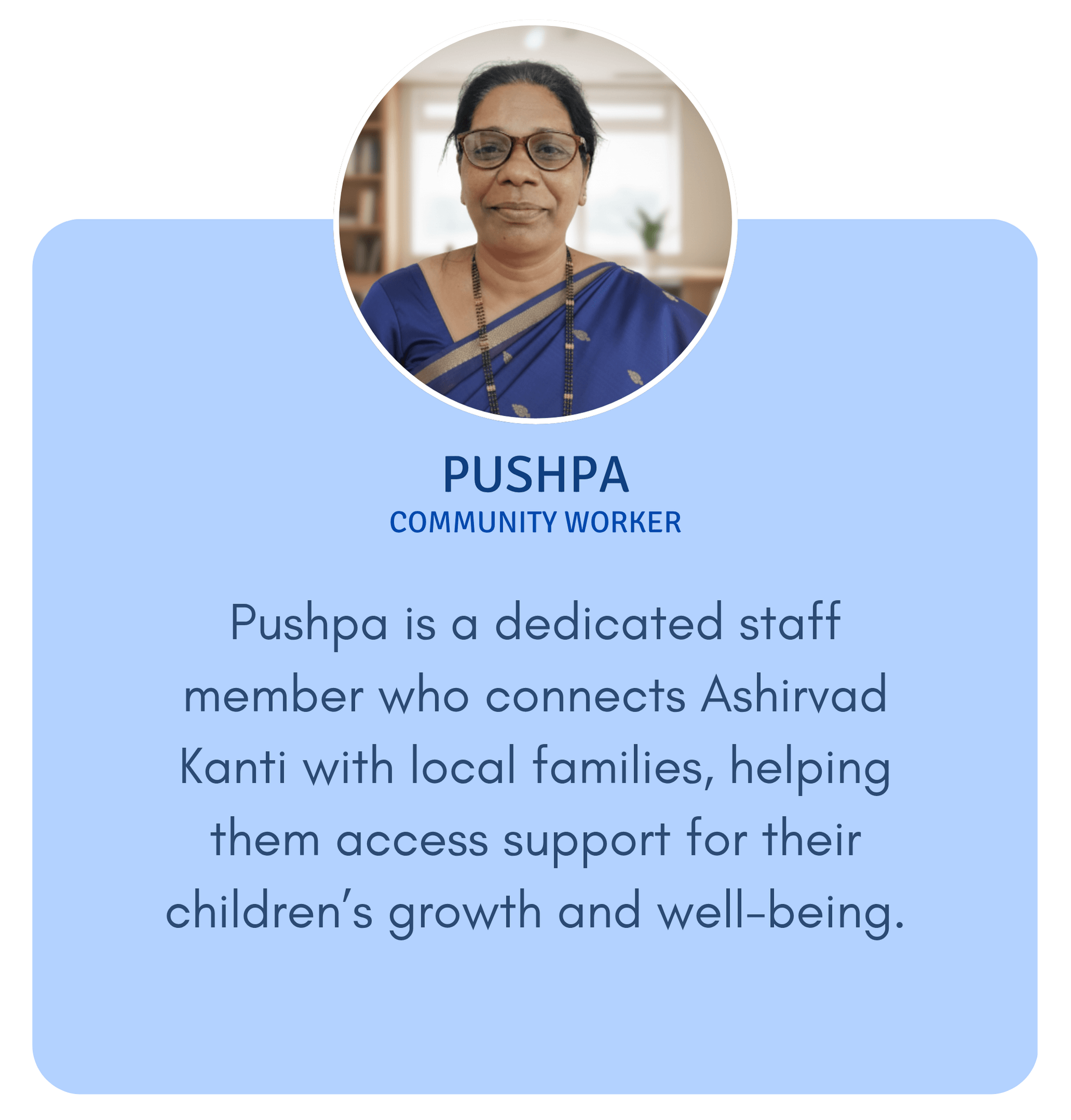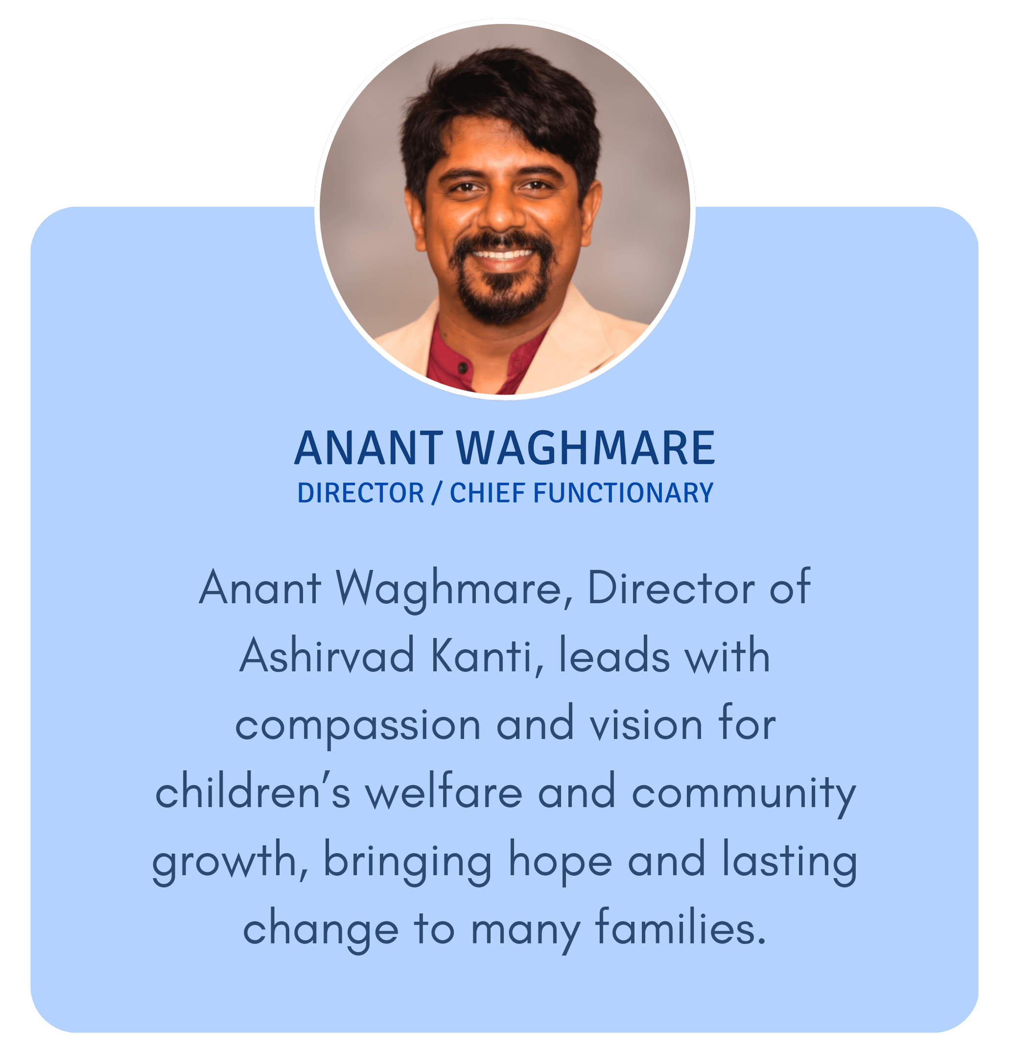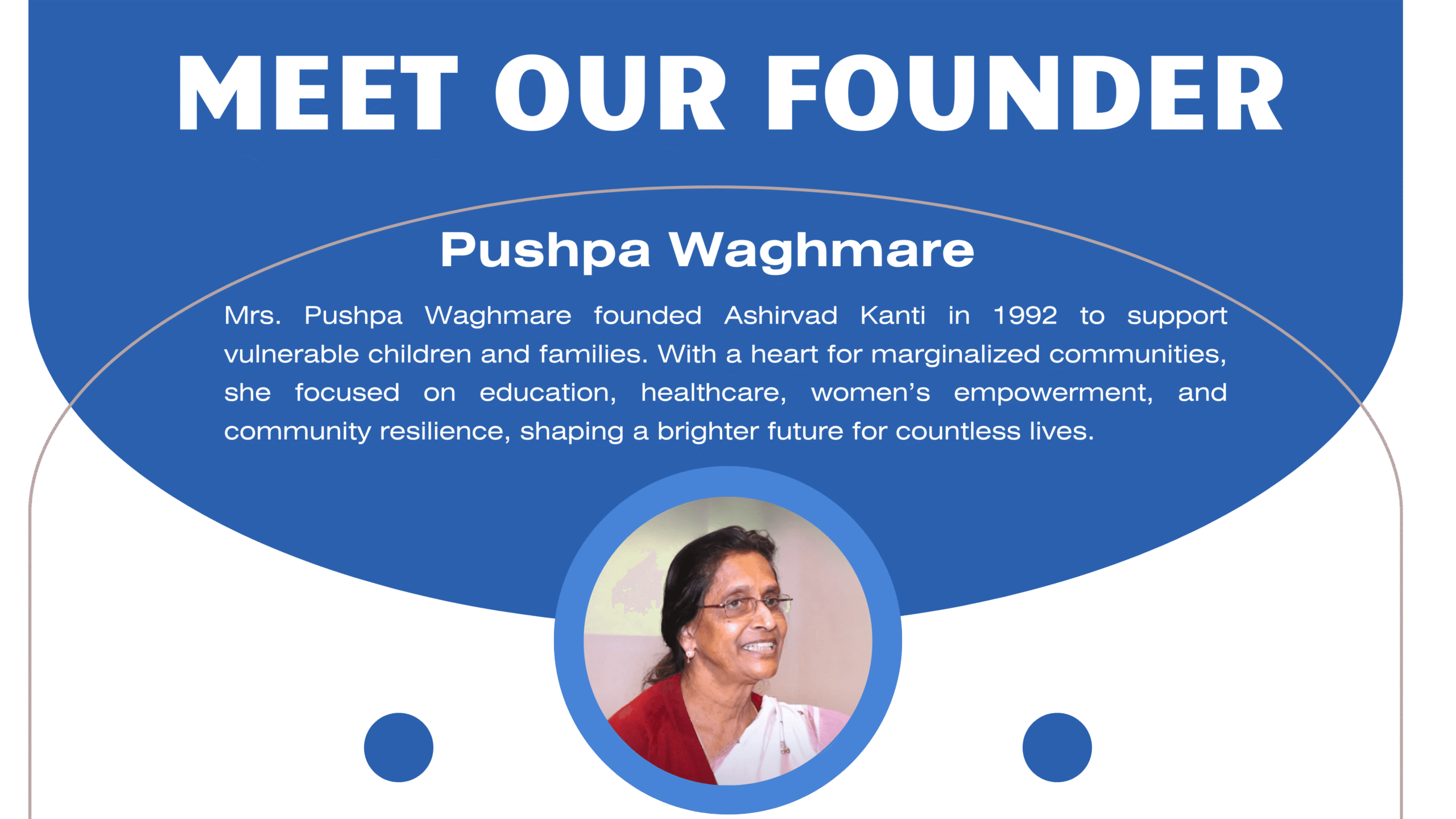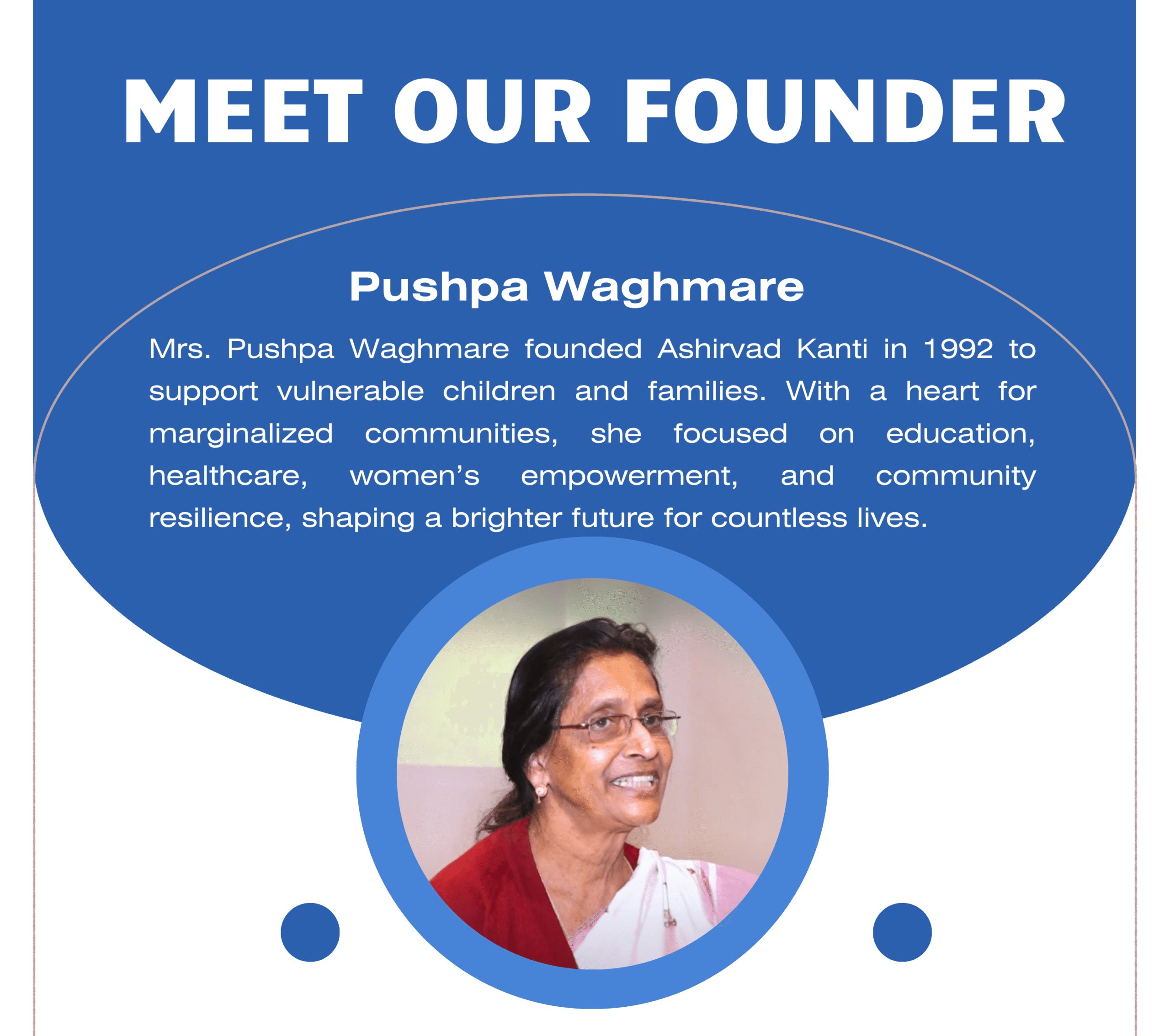 Ashirvad Kanti was founded in 1992 with a deep commitment to the welfare, empowerment, and growth of children. Inspired by the compassionate vision of our founder, Mrs. Pushpa Waghmare, we have always believed that every child deserves love, care, and the chance to thrive. From the beginning, our work has reached into underserved communities, offering not just support but hope. Through holistic programs, we aim to uplift children and families, open doors to opportunities, and create brighter futures where no one is left behind.